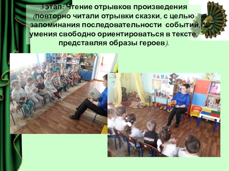 3 этап: Чтение отрывков произведения (повторно читали отрывки сказки, с целью запоминания последовательности событий, умения свободно ориентироваться