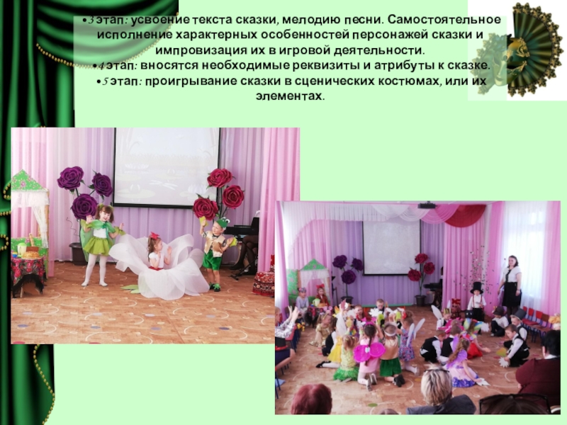 персонажей сказки и импровизация их в игровой деятельности. •4 этап: вносятся необходимые реквизиты и атрибуты к сказке. •5 этап: проигрывание сказки в сценических костюмах, или их элементах.
