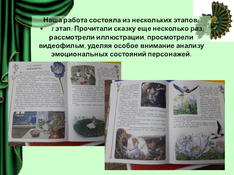 Наша работа состояла из нескольких этапов: •	1 этап: Прочитали сказку еще несколько раз, рассмотрели иллюстрации, просмотрели видеофильм,