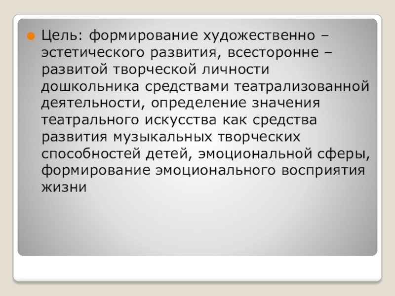 дошкольника средствами театрализованной деятельности, определение значения театрального искусства как средства развития музыкальных творческих способностей детей, эмоциональной сферы, формирование эмоционального восприятия жизни