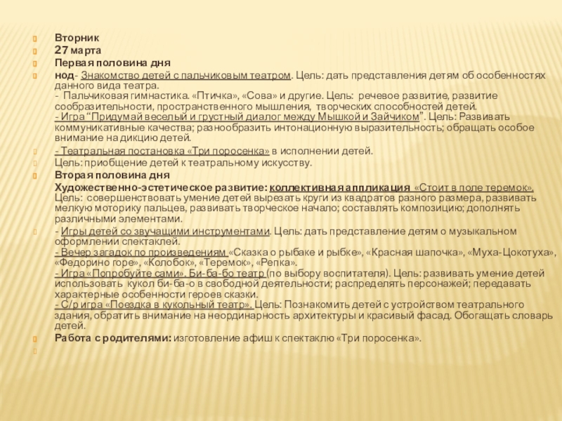 Цель: дать детям представление о театре; расширять знания театра как вида искусства; познакомить с видами театров; воспитывать эмоционально положительное отношение к театру.