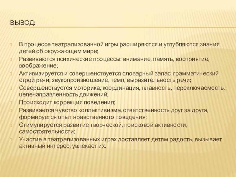 деятельность позволяет формировать опыт социальных навыков поведения благодаря тому, что каждая сказка или литературное произведение для детей дошкольного возраста всегда имеют нравственную направленность (доброта, смелость, дружба и т.д.). Благодаря театру ребенок познает мир не только умом, но и сердцем и выражает свое собственное отношение к добру и злу. Театрализованная деятельность помогает ребенку преодолеть робость, неуверенность в себе, застенчивость. Театр в детском саду научит ребенка видеть прекрасное в жизни и в людях, зародит стремление самому нести в жизнь прекрасное и доброе. Таким образом, театр помогает ребенку развиваться всесторонне.