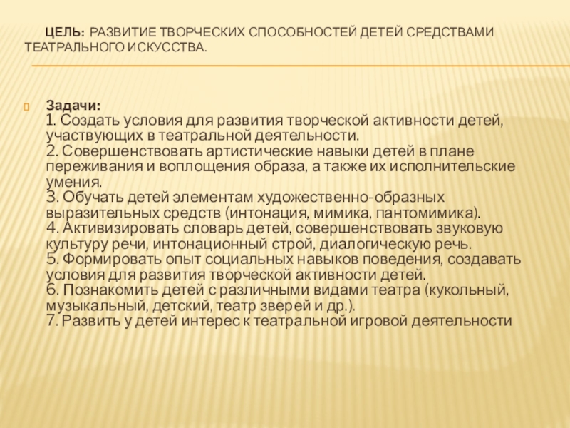 Слайд 3 Цель: Развитие творческих способностей детей средствами театрального