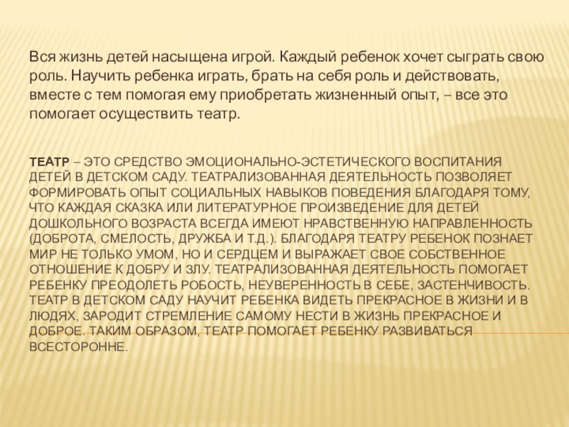 Вся жизнь детей насыщена игрой. Каждый ребенок хочет сыграть свою роль. Научить ребенка играть, брать на себя роль и действовать, вместе с тем помогая ему приобретать жизненный опыт, – все это помогает осуществить театр.