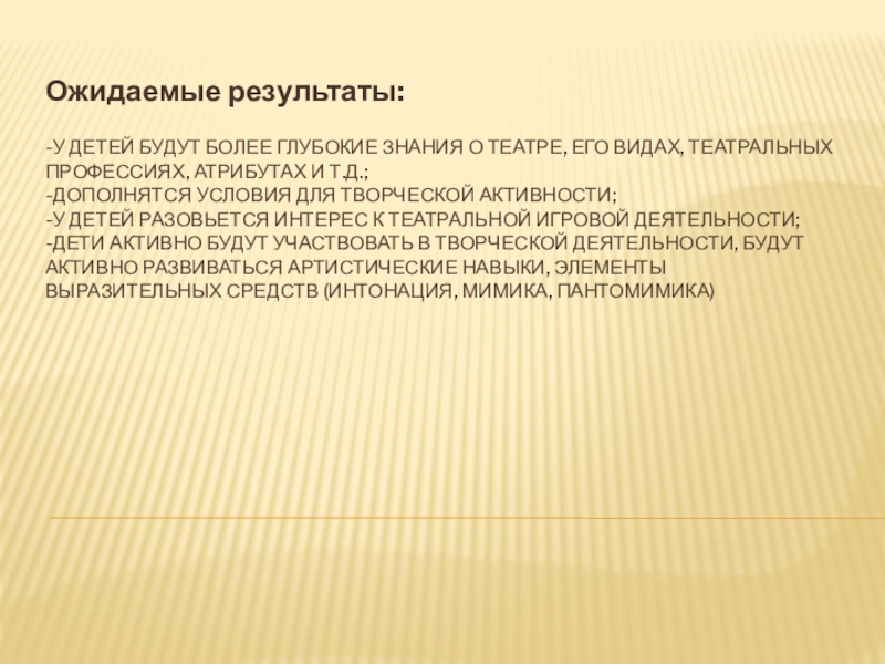 -дети активно будут участвовать в творческой деятельности, будут активно развиваться артистические навыки, элементы выразительных средств (интонация, мимика, пантомимика)