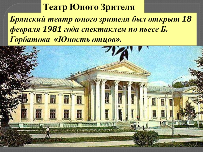 Театр Юного ЗрителяБрянский театр юного зрителя был открыт 18 февраля 1981 года спектаклем по пьесе Б.Горбатова  «Юность