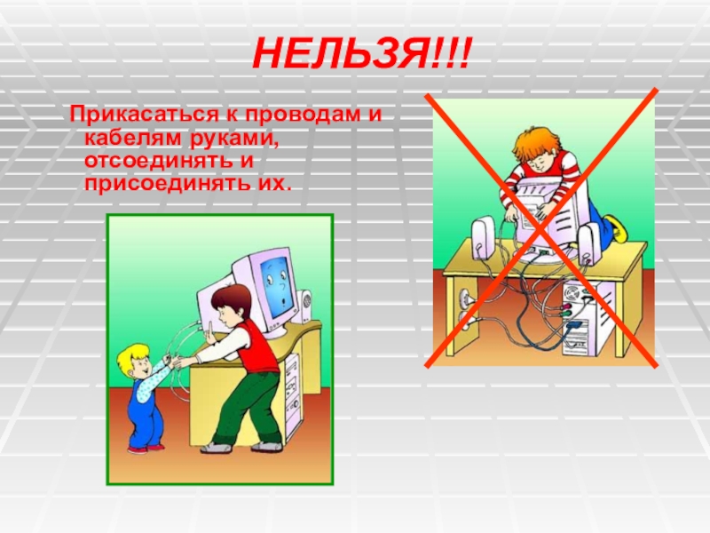 НЕЛЬЗЯ!!!   Прикасаться к проводам и кабелям руками, отсоединять и присоединять их.