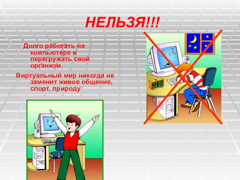 НЕЛЬЗЯ!!!   Долго работать на компьютере и перегружать свой организм. Виртуальный мир никогда не заменит живое