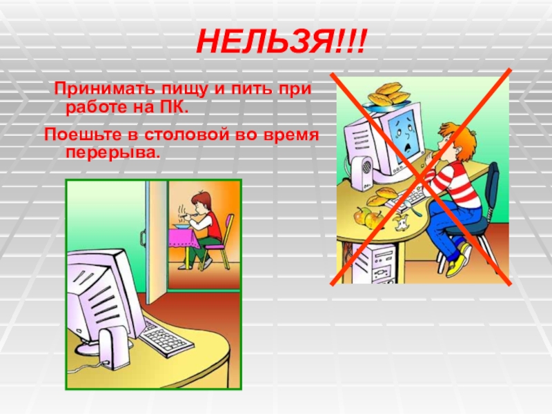 НЕЛЬЗЯ!!!   Принимать пищу и пить при работе на ПК.  Поешьте в столовой во время
