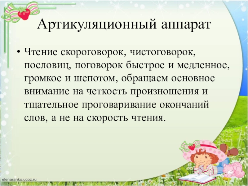 шепотом, обращаем основное внимание на четкость произношения и тщательное проговаривание окончаний слов, а не на скорость чтения.