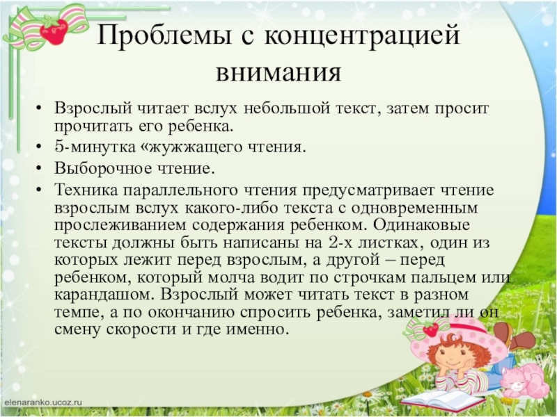 Техника параллельного чтения предусматривает чтение взрослым вслух какого-либо текста с одновременным прослеживанием содержания ребенком. Одинаковые тексты должны быть написаны на 2-х листках, один из которых лежит перед взрослым, а другой – перед ребенком, который молча водит по строчкам пальцем или карандашом. Взрослый может читать текст в разном темпе, а по окончанию спросить ребенка, заметил ли он смену скорости и где именно.