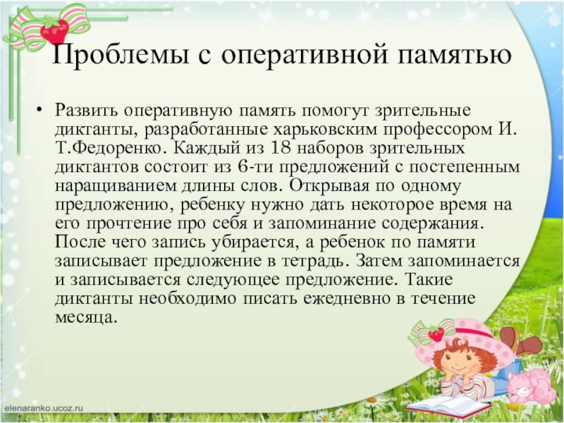 профессором И.Т.Федоренко. Каждый из 18 наборов зрительных диктантов состоит из 6-ти предложений с постепенным наращиванием длины слов. Открывая по одному предложению, ребенку нужно дать некоторое время на его прочтение про себя и запоминание содержания. После чего запись убирается, а ребенок по памяти записывает предложение в тетрадь. Затем запоминается и записывается следующее предложение. Такие диктанты необходимо писать ежедневно в течение месяца.