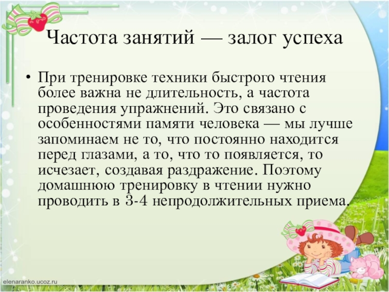 не длительность, а частота проведения упражнений. Это связано с особенностями памяти человека — мы лучше запоминаем не то, что постоянно находится перед глазами, а то, что то появляется, то исчезает, создавая раздражение. Поэтому домашнюю тренировку в чтении нужно проводить в 3-4 непродолжительных приема.