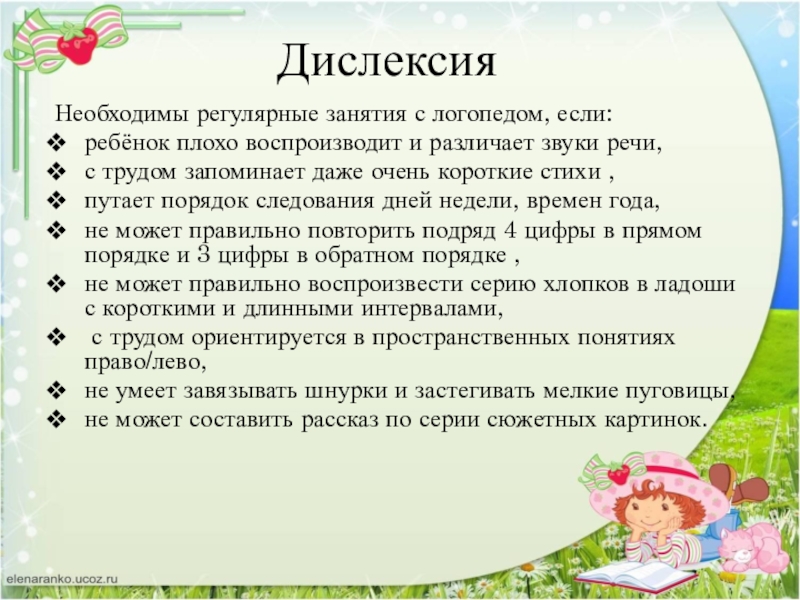 Дислексия – избирательное нарушение способности к овладению навыками чтения при сохранности общей способности к обучению.