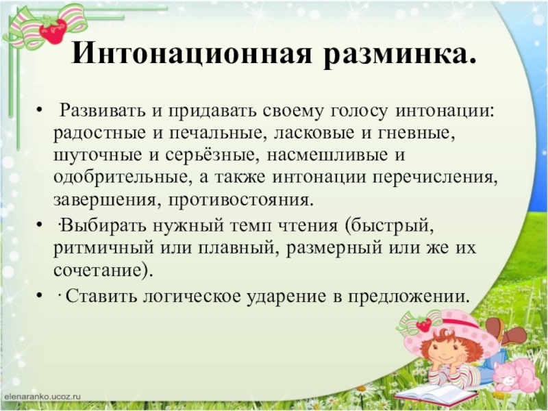 ·Выбирать нужный темп чтения (быстрый, ритмичный или плавный, размерный или же их сочетание).