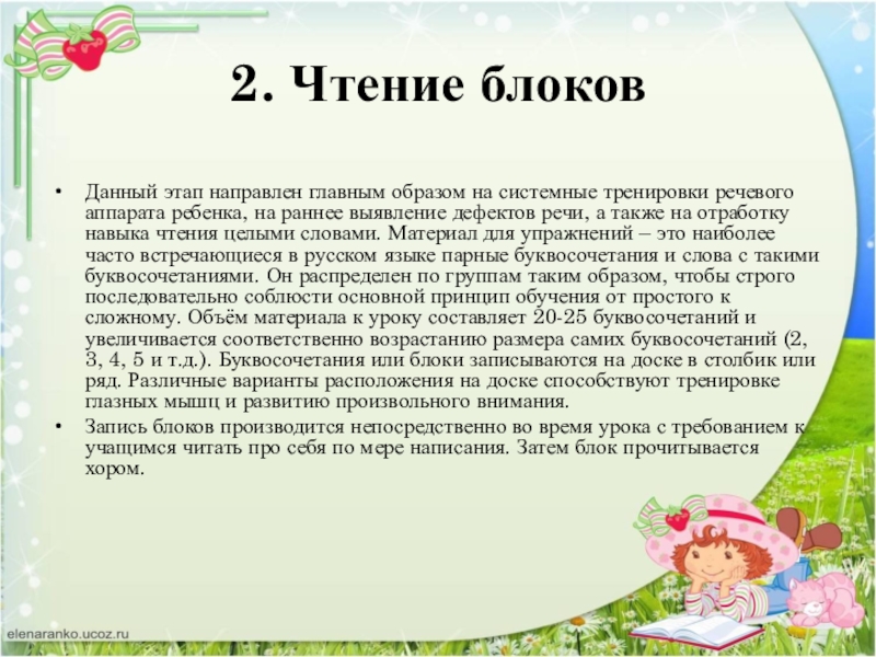 аппарата ребенка, на раннее выявление дефектов речи, а также на отработку навыка чтения целыми словами. Материал для упражнений – это наиболее часто встречающиеся в русском языке парные буквосочетания и слова с такими буквосочетаниями. Он распределен по группам таким образом, чтобы строго последовательно соблюсти основной принцип обучения от простого к сложному. Объём материала к уроку составляет 20-25 буквосочетаний и увеличивается соответственно возрастанию размера самих буквосочетаний (2, 3, 4, 5 и т.д.). Буквосочетания или блоки записываются на доске в столбик или ряд. Различные варианты расположения на доске способствуют тренировке глазных мышц и развитию произвольного внимания.