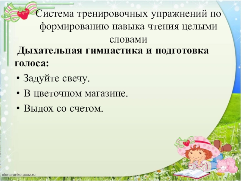Слайд 15Система тренировочных упражнений по формированию навыка чтения целыми словами