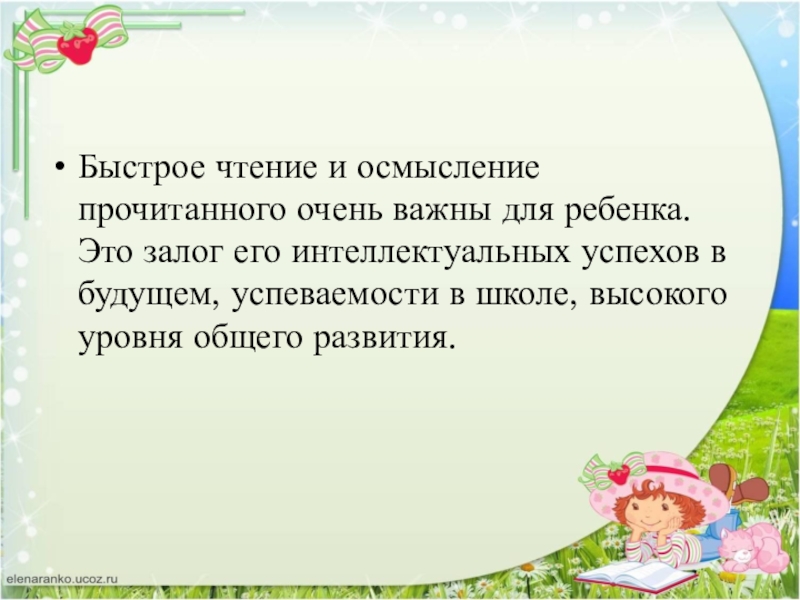 Слайд 2Быстрое чтение и осмысление прочитанного очень важны для ребенка. Это залог