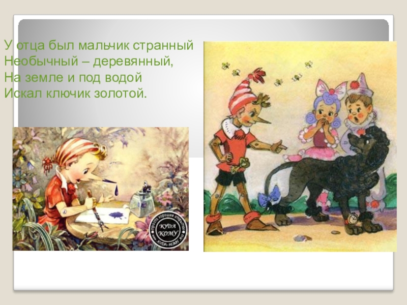 У отца был мальчик странныйНеобычный – деревянный,На земле и под водойИскал ключик золотой.