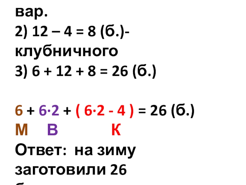 (б.)-клубничного 3) 6 + 12 + 8 = 26 (б.) 6 + 6·2 + ( 6·2 - 4 ) = 26 (б.) М В К Ответ: на зиму заготовили 26 банок варенья.