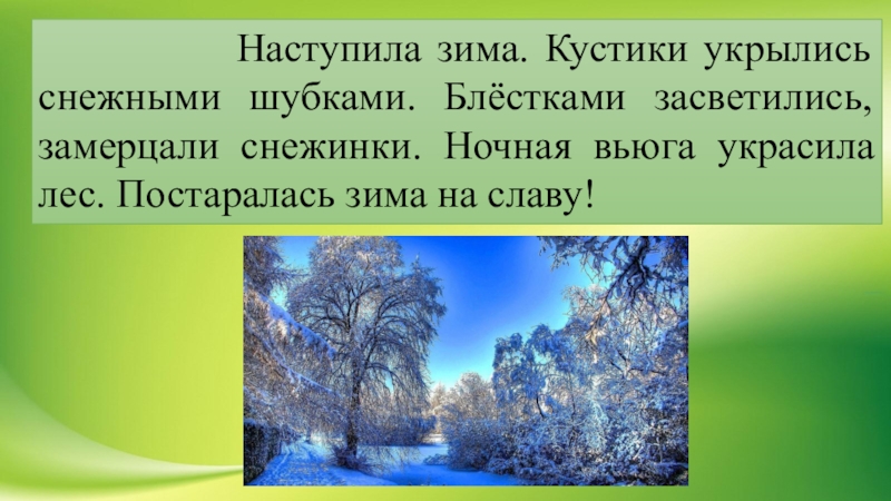 снежными шубками. Блёстками засветились, замерцали снежинки. Ночная вьюга украсила лес. Постаралась зима на славу!