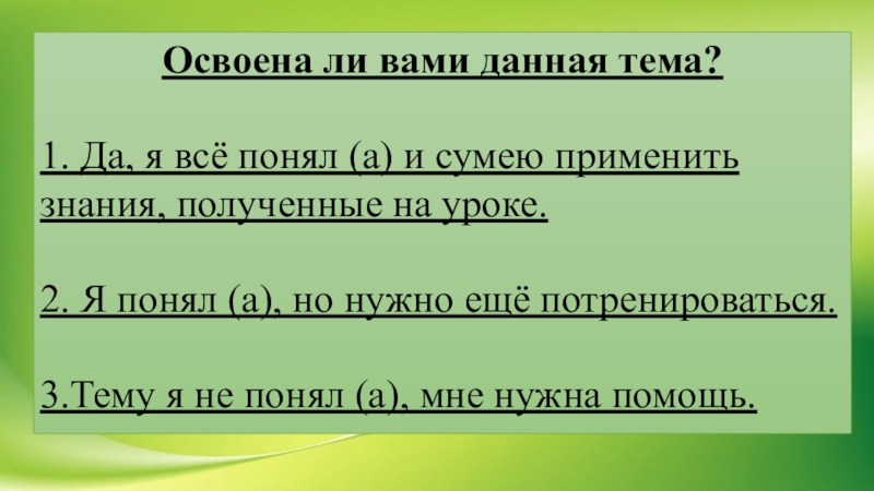 Освоена ли вами данная тема?1. Да, я всё понял (а) и сумею применить знания, полученные на уроке.2.