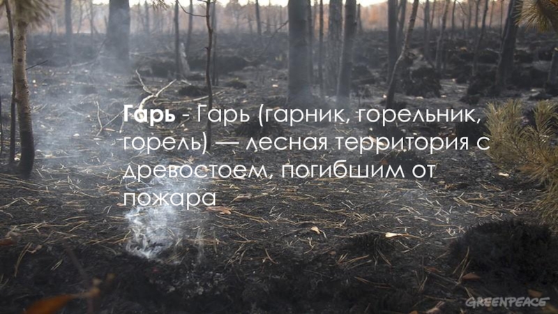 Слайд 10Гарь - Гарь (гарник, горельник, горель) — лесная территория с древостоем,