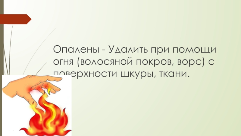 Слайд 14Опалены - Удалить при помощи огня (волосяной покров, ворс) с поверхности