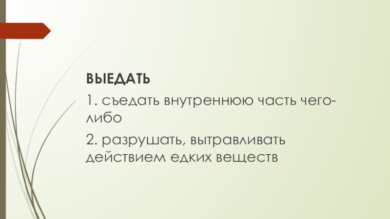 ВЫЕДАТЬ1. съедать внутреннюю часть чего-либо2. разрушать, вытравливать действием едких веществ