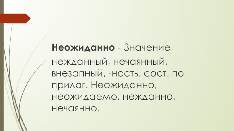 Неожиданно - Значение нежданный, нечаянный, внезапный. -ность, сост. по прилаг. Неожиданно, неожидаемо, нежданно, нечаянно.
