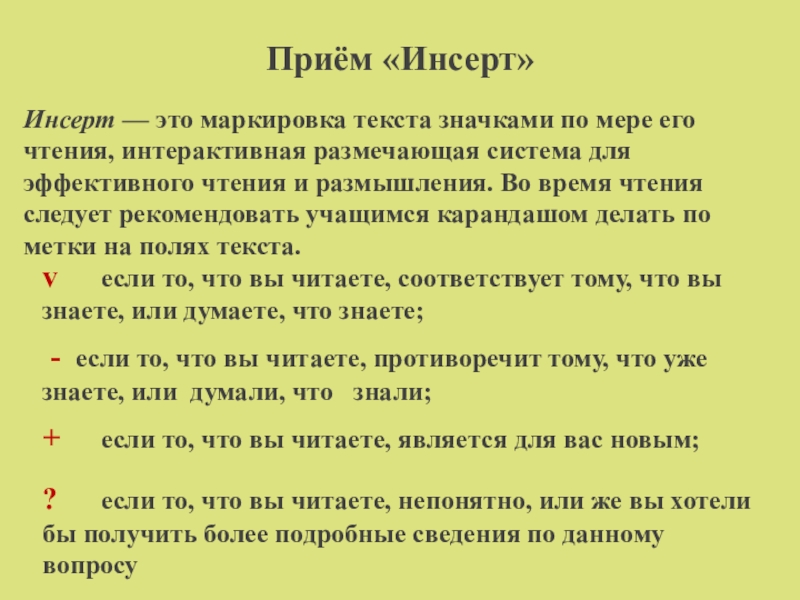 Инсерт — это маркировка текста значками по мере его чтения, интерактивная размечающая система для эффективного чтения и размышления. Во время чтения следует рекомендовать учащимся карандашом делать пометки на полях текста.