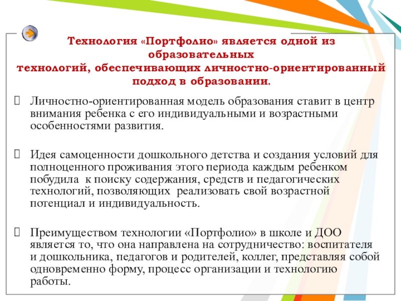 Преимуществом технологии «Портфолио» в школе и ДОО является то, что она направлена на сотрудничество: воспитателя и дошкольника, педагогов и родителей, коллег, представляя собой одновременно форму, процесс организации и технологию работы.