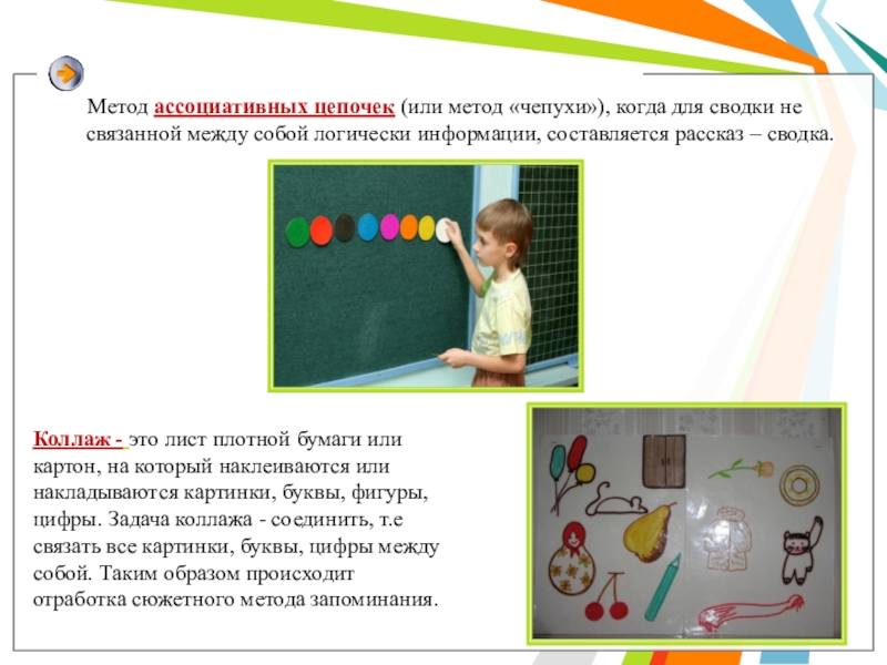 или накладываются картинки, буквы, фигуры, цифры. Задача коллажа - соединить, т.е связать все картинки, буквы, цифры между собой. Таким образом происходит отработка сюжетного метода запоминания.