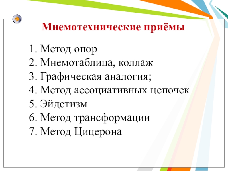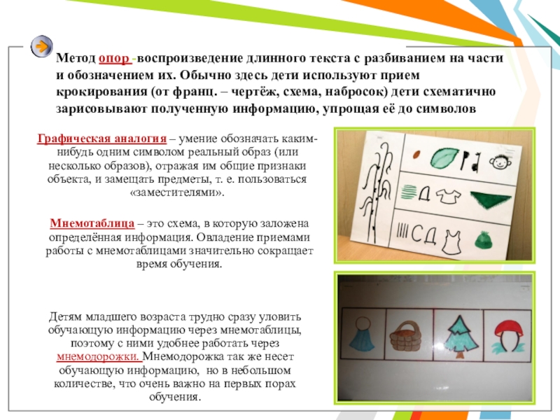 Слайд 24Метод опор -воспроизведение длинного текста с разбиванием на части и обозначением