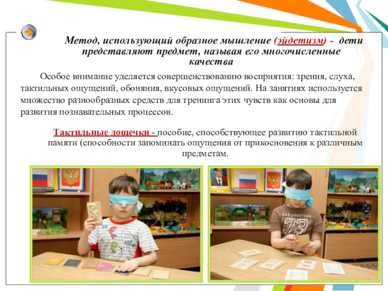 тактильных ощущений, обоняния, вкусовых ощущений. На занятиях используется множество разнообразных средств для тренинга этих чувств как основы для развития познавательных процессов.
