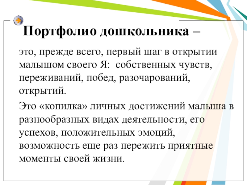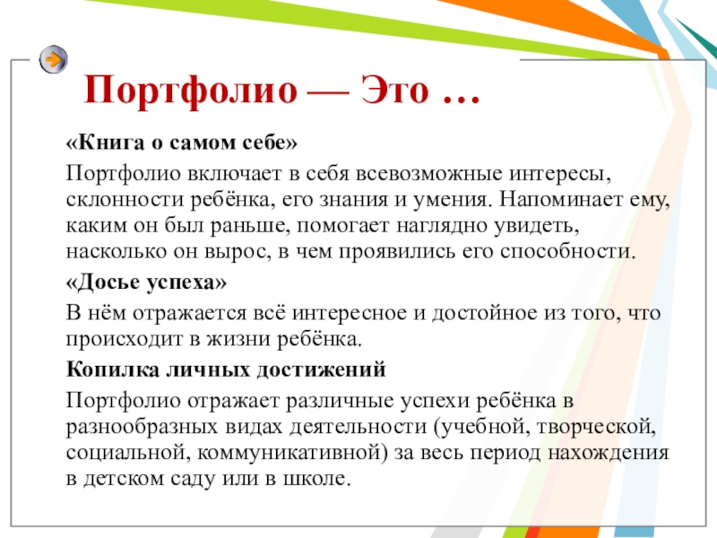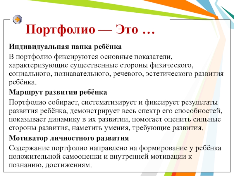 Портфолио собирает, систематизирует и фиксирует результаты развития ребёнка, демонстрирует весь спектр его способностей, показывает динамику в их развитии, помогает оценить сильные стороны развития, наметить умения, требующие развития.