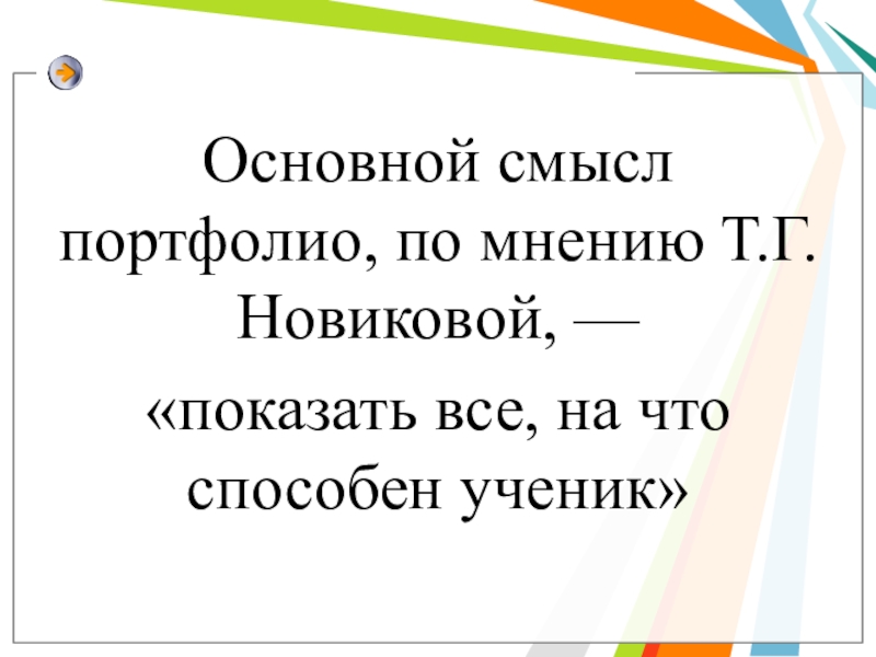 Слайд 39Основной смысл портфолио, по мнению Т.Г. Новиковой, —