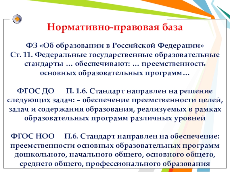 Ст. 11. Федеральные государственные образовательные стандарты … обеспечивают: … преемственность основных образовательных программ…