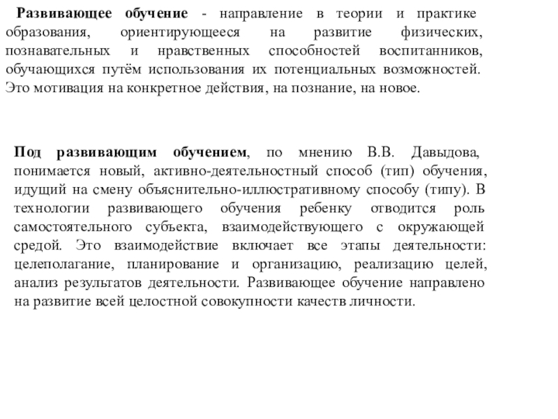 Под развивающим обучением, по мнению В.В. Давыдова, понимается новый, активно-деятельностный способ (тип) обучения, идущий на смену объяснительно-иллюстративному способу (типу). В технологии развивающего обучения ребенку отводится роль самостоятельного субъекта, взаимодействующего с окружающей средой. Это взаимодействие включает все этапы деятельности: целеполагание, планирование и организацию, реализацию целей, анализ результатов деятельности. Развивающее обучение направлено на развитие всей целостной совокупности качеств личности.