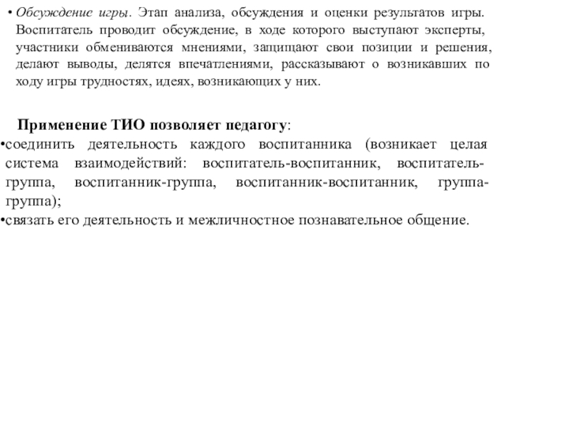 Проведение игры. Этот этап включает собственно процесс игры. С момента начала игры никто не имеет права вмешиваться и изменять ее ход. Только ведущий может корректировать действия участников, если они отклоняются от главной цели игры. Воспитатель, начав игру, не должен без необходимости принимать в ней участие. Его задачи заключаются в том , чтобы следить за игровыми действиями, результатами