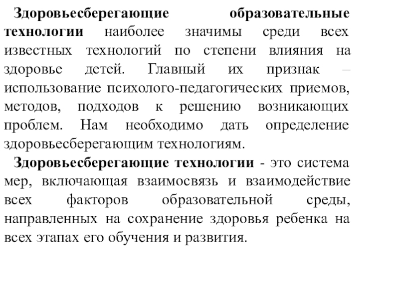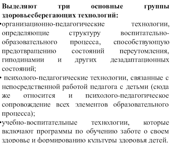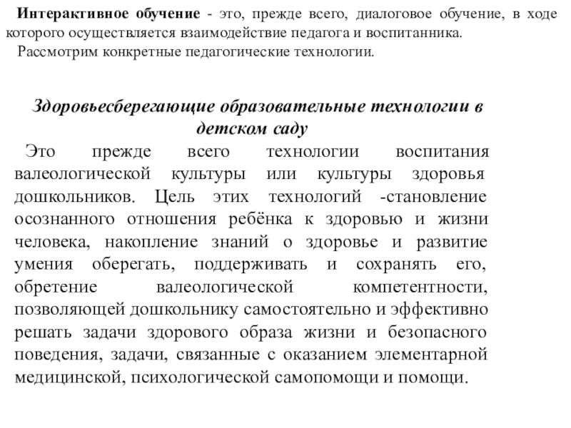 Это прежде всего технологии воспитания валеологической культуры или культуры здоровья дошкольников. Цель этих технологий -становление осознанного отношения ребёнка к здоровью и жизни человека, накопление знаний о здоровье и развитие умения оберегать, поддерживать и сохранять его, обретение валеологической компетентности, позволяющей дошкольнику самостоятельно и эффективно решать задачи здорового образа жизни и безопасного поведения, задачи, связанные с оказанием элементарной медицинской, психологической самопомощи и помощи.