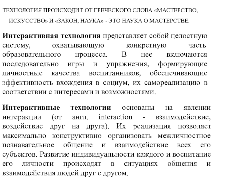 Интерактивные технологии основаны на явлении интеракции (от англ. interaction - взаимодействие, воздействие друг на друга). Их реализация позволяет максимально конструктивно организовать межличностное познавательное общение и взаимодействие всех его субъектов. Развитие индивидуальности каждого и воспитание его личности происходят в ситуациях общения и взаимодействия людей друг с другом.