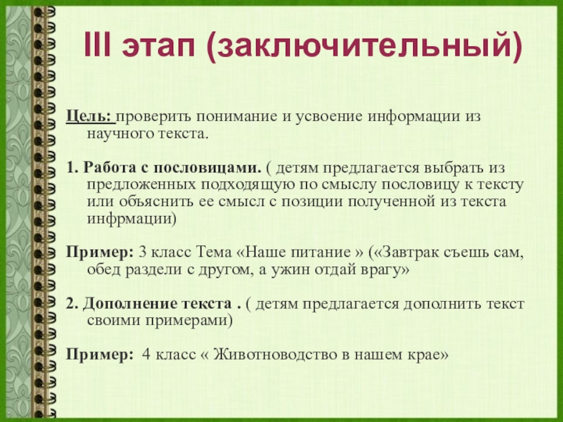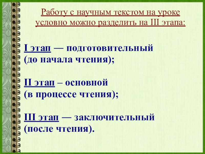 Слайд 11Работу с научным текстом на уроке условно можно разделить на III