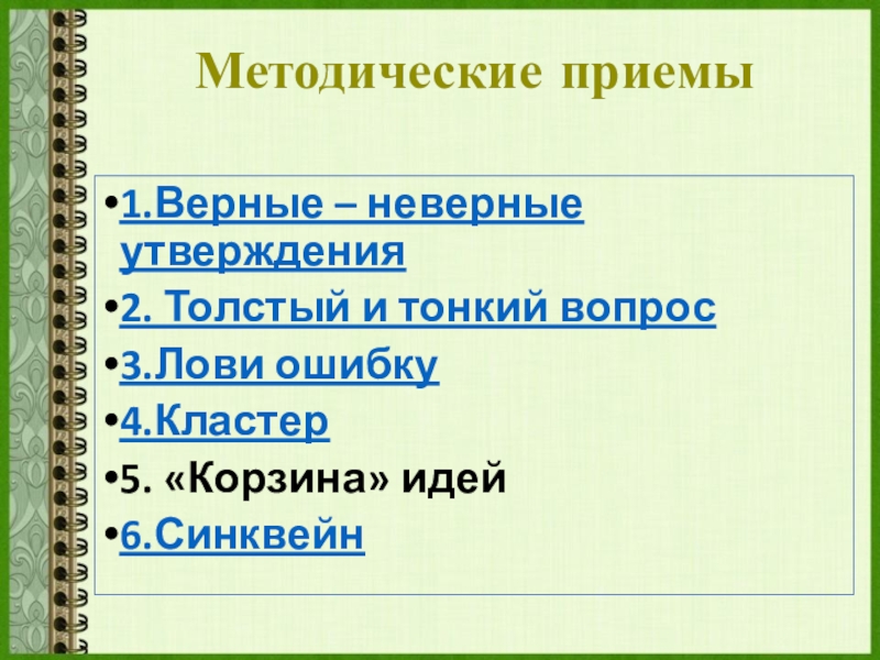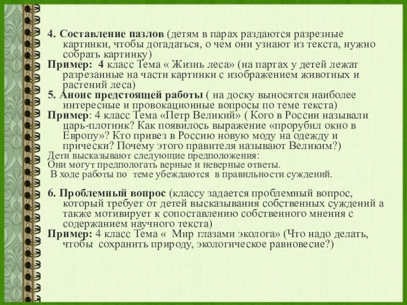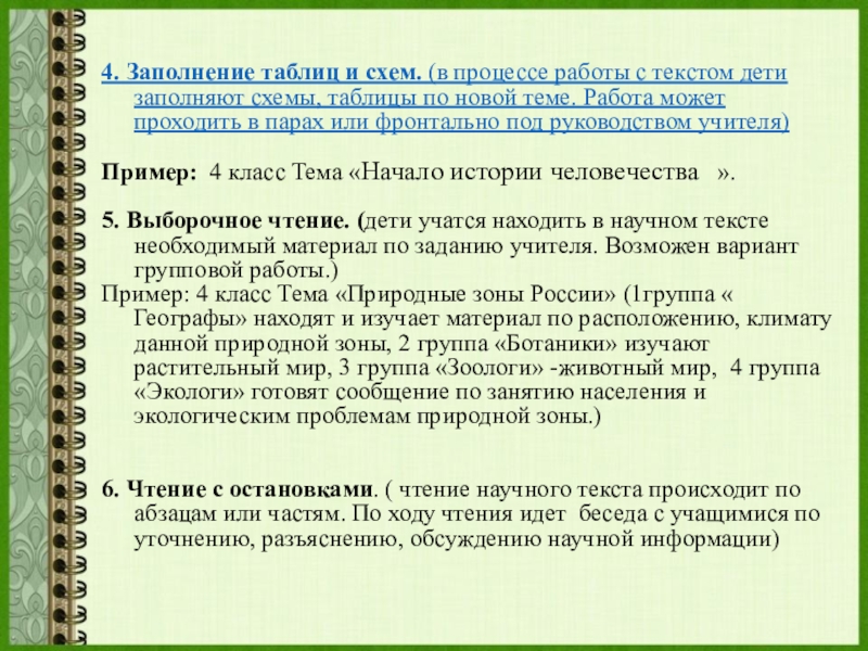 6. Чтение с остановками. ( чтение научного текста происходит по абзацам или частям. По ходу чтения идет беседа с учащимися по уточнению, разъяснению, обсуждению научной информации)