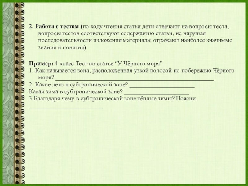 Слайд 152. Работа с тестом (по ходу чтения статьи дети отвечают на