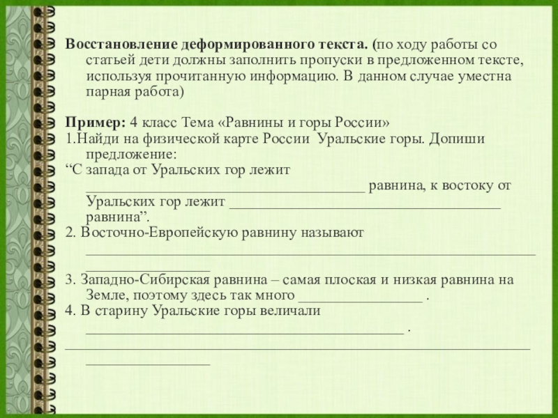 Слайд 16Восстановление деформированного текста. (по ходу работы со статьей дети должны заполнить