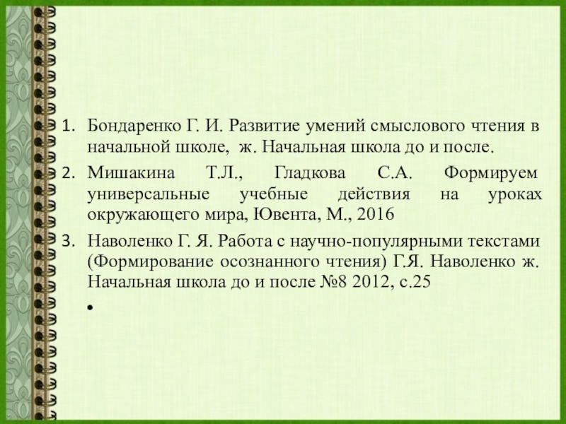 Слайд 22Бондаренко Г. И. Развитие умений смыслового чтения в начальной школе, ж.