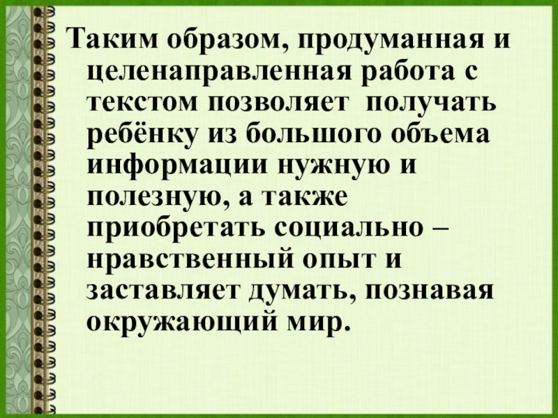 Слайд 21Таким образом, продуманная и целенаправленная работа с текстом позволяет получать ребёнку