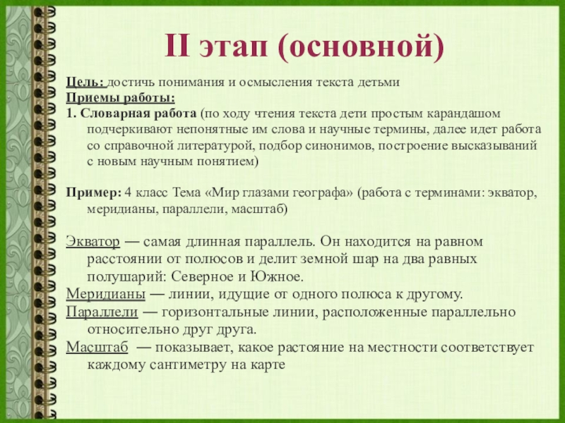 Пример: 4 класс Тема «Мир глазами географа» (работа с терминами: экватор, меридианы, параллели, масштаб)