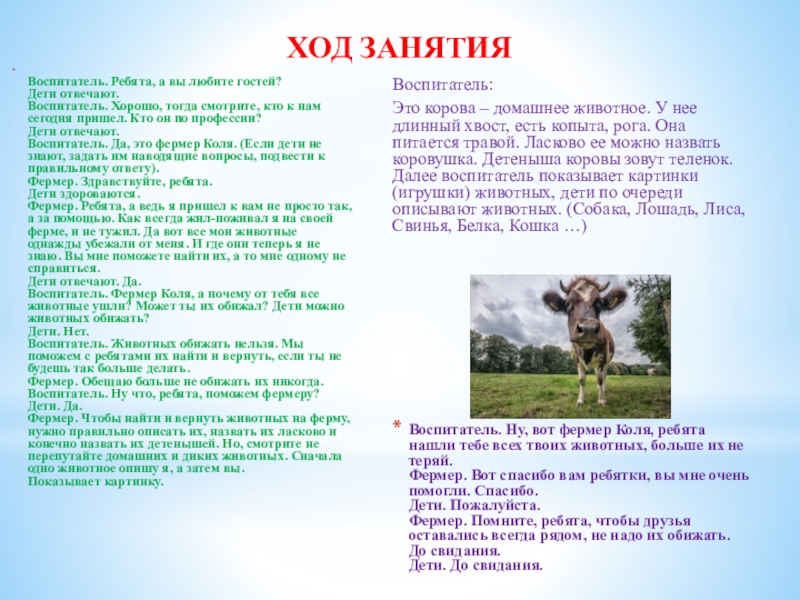Воспитатель. Ну, вот фермер Коля, ребята нашли тебе всех твоих животных, больше их не теряй.